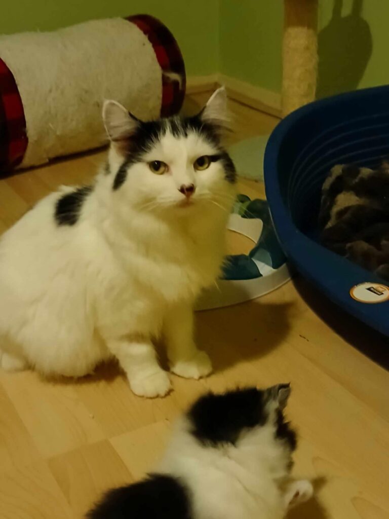 She came into our care in September after living outside and giving birth , but sadly all the kittens disappeared. By the time she came into our care she was pregnant again. She gave birth to two kittens but one suddenly died at 4 weeks old. She is still with her only baby girl.